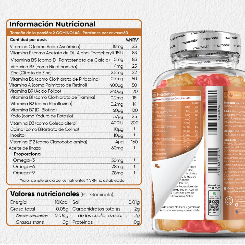 Jarabe de glucosa, azúcar, dextrosa, pectina, aceite de linaza (fuente natural de Omega 3, 6 y 9), ácido cítrico, citrato de sodio, glicerina, aceite MCT, vitamina C (ácido ascórbico), vitamina E (acetato de DL-alfa-tocoferol), zinc (citrato de zinc), vitamina B5 (pantotenato de calcio), vitamina B3 (niacina), extracto de romero, betacaroteno, zumo concentrado de zanahoria morada, vitamina B6 (clorhidrato de piridoxina), vitamina A (palmitato de retinol), yodo (yoduro de potasio), vitamina D3 (colecalciferol, fuente: lanolina), vitamina B12 (cianocobalamina), vitamina B1 (clorhidrato de tiamina), vitamina B9 (ácido fólico), vitamina B2 (riboflavina), vitamina B7 (biotina), colina, inositol.