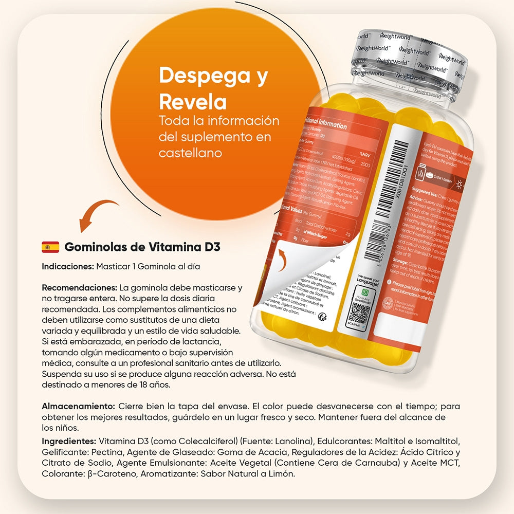 Nuestras gominolas de Vitamina D3 aportan 4000 UI de colecalciferol por dosis en un formato masticable y delicioso, ideal para quienes prefieren evitar cápsulas o tabletas.